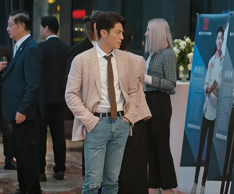 米色休闲西装搭配蓝色牛仔裤,既不会像黑白西装看起来沉闷刻板,又保留了一丝正式场合的得体,霍建华的身材也保持不错,没有发福也不过于清瘦,比例协调。